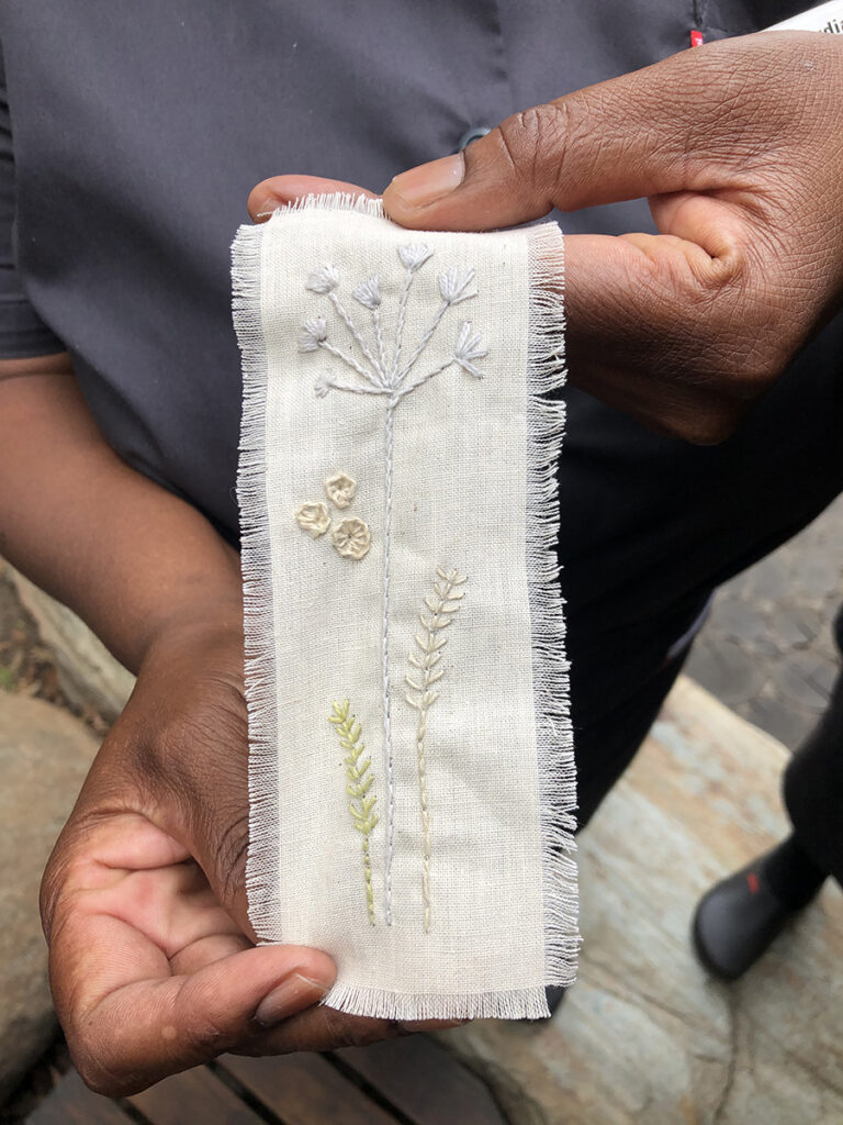 Above: Previously, we have hosted training sessions with the fabulous ladies of the housekeeping department and enjoyed witnessing the skills-sharing and quality time together – including with some team members whom have been at Jabulani for almost 15 years. Together, we created embroidered turn-down gifts, with a story attached about the particular housekeeper who made each item, for guests at Jabulani.