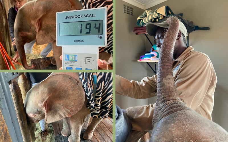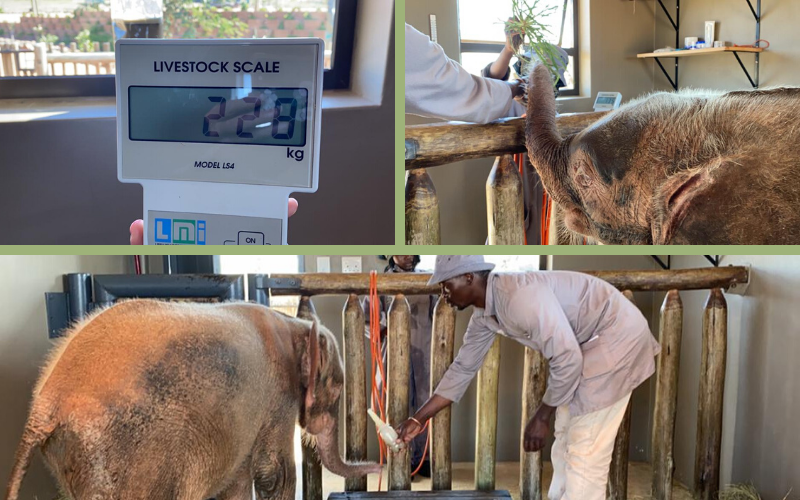 Little Khanyisa gets back on the scale for a weigh-in! Her curious trunk makes it difficult for carer, Godknows to make sure the precious milk formula doesn’t spill as he tries to keep an eye on her little mouth in spite of the trunk eyepatch coming his way.