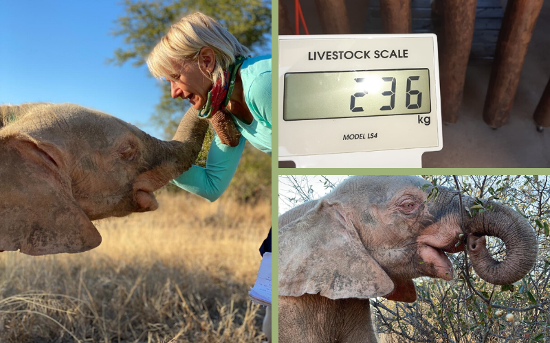 Her 228kgs shine in comparison to the 124 kgs that she weighed when she was rescued in January 2020. It’s not just your eyes! She really is getting bigger! “Jy word nou ‘n olifant!” Adine says to Khanyisa.