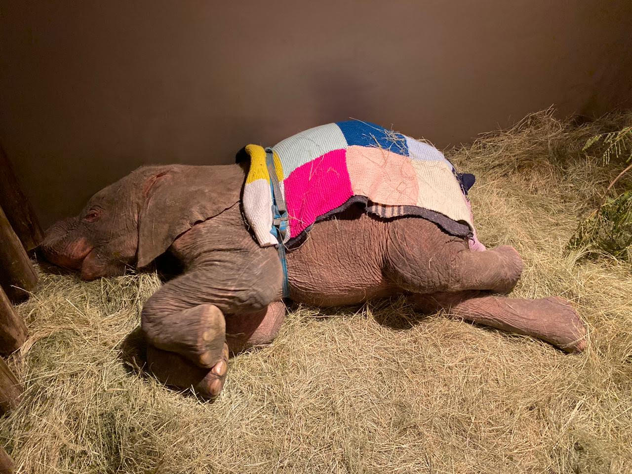 Young orphan African baby elephants raised and cared for in orphanages seem to prefer sleeping, similar to us humans, in a safe, warm and comfy spot. They enjoy a soft bed of straw or grass to lie on and a multi-coloured blanket to keep them warm when the night-time and their own body temperature drops – without Mom’s body to keep them warm and her milk to keep them perfectly, ideally, tip-top. Little Khanyisa falls asleep sometimes while her carer is in the room, whispering goodnight or singing soothingly, surrounded by warmth and love, with Lammie her companion sheep alongside her.